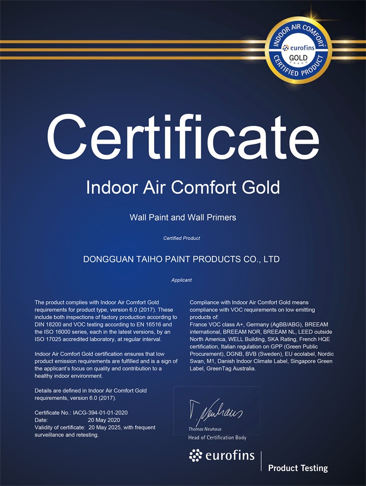 IAC-Gold(Indoor Air Comfort-Gold室內空氣質量-金級)是目前歐洲室內VOC排放最嚴格的檢測標準,由總部設立于比利時的第三方獨立檢測機構歐陸科技(Eurofin)認證。通過IAC Gold認證的產品,其生產工廠必須每年接受第三方獨立檢測機構的驗廠審核,而且室內VOC排放近零,無環境污染,不會威脅人體健康。