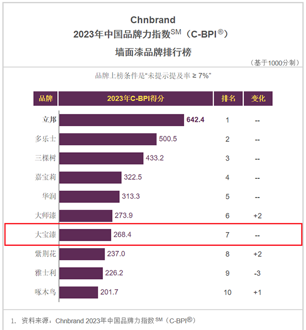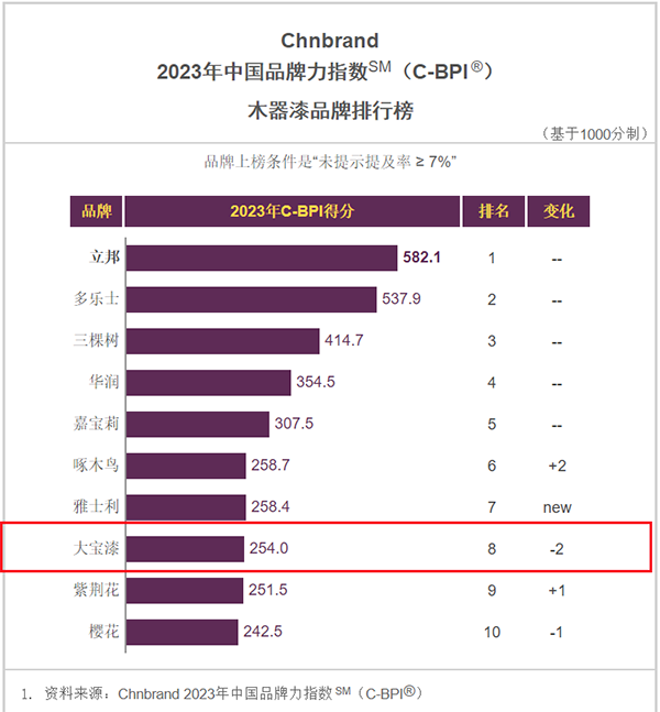 4月18日,品牌評級機構Chnbrand發布2023年第十三屆中國品牌力指數sm(C-BPI)品牌排名,大寶漆再度上榜“墻面漆品牌排行榜”、“木器漆品牌排行榜”雙榜單,彰顯品牌影響力。