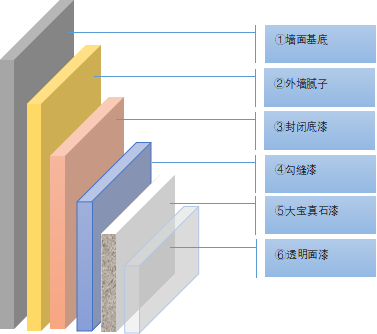 真石漆是以高品質純丙烯酸合成乳液為主要粘結劑, 以天然彩砂為骨料及選用各種優質助劑配制而成,具有耐水性、耐堿性好,粘接強度高,涂層堅硬,耐候性優等特性。晶瑩剔透的漆面突出強烈的藝術效果 ,是一種高級、自然、莊重、樸實具有天然風格的豪華型裝飾涂料