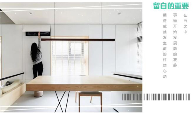 現(xiàn)代社會(huì)信息量龐大,試著在生活中拿掉些甚么,提醒自己適當(dāng)放松卻又不能太過,「平衡」是留白哲學(xué)的關(guān)鍵之一,為緊湊的生活建置一小塊能夠呼吸的空間給自己,慢慢領(lǐng)略是「時(shí)間」讓空間中的留白發(fā)揮了作用。